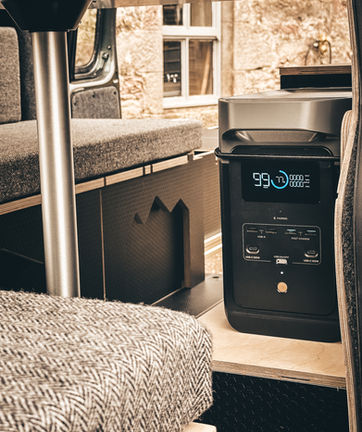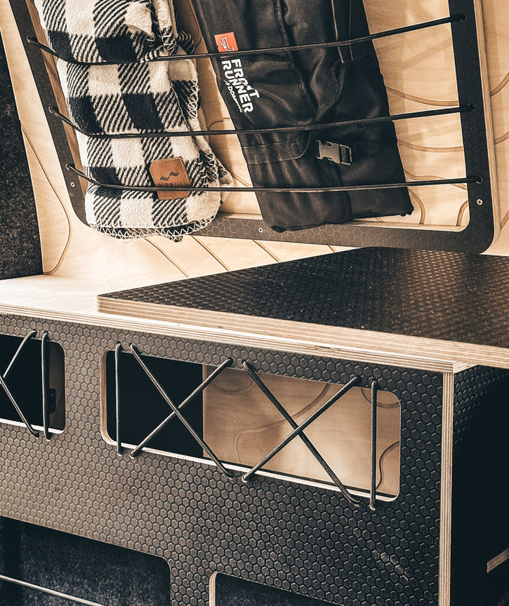 Strikingly contrasted with our Black Hexa birch plywood and natural worktops (both low and high level). This also helps to create the illusion of space and lightness in your van. Keeping dark colours low and lighter highlights to the top, brightening the environment.