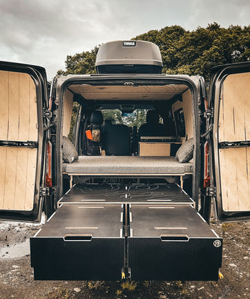 in a SWB your bed system will take up 1800mm on the driver side and in most medium van types will leave you with approx 500mm usable space behind the driver seat for a kitchen pod. Our 'Bruich' range is here to fill that gap and provide various options to add more cooking/prep or storage functionality to your SWB build.
